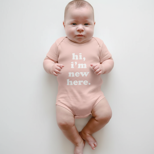 Hi, I'm New Here in Rose Organic Cotton Baby Onesie